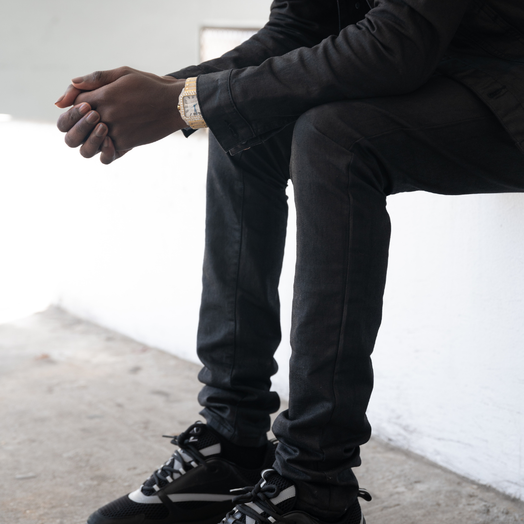 Waxed denim, where denim is finished with a coating that resembles candle wax. It has been popular for a few seasons. The textural effect is comfortable, slightly stretchy and quite shiny in an interesting matte way. It often resembles the look of leather.